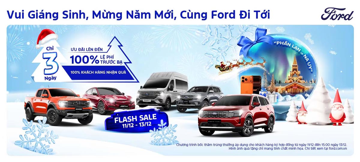 Ford Việt Nam cùng hệ thống đại lý ủy quyền trên toàn quốc hân hạnh công bố chương trình khuyến mãi đặc biệt “Vui Giáng Sinh, Mừng Năm Mới, Cùng Ford Đi Tới”. Sự kiện này được thiết kế để nhân đôi niềm vui cho quý khách hàng khi chọn mua các dòng xe Ford mới nhất, với tổng giá trị giải thưởng cực kỳ hấp dẫn, tập trung vào ba ngày vàng duy nhất.